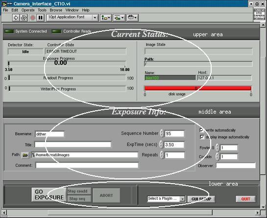 fits header as a the value of the write automatically: If checked, the image will be written to disk automatically after being read and preprocessed. If not checked, a button called write will appear when the image is ready for being written, so the user can examine the image and write it only if desired. display automatically: If checked, the image will be displayed, when ready, automatically on the image displayer (Ximtool or DS9) if this is opened. All this is "static" information, in the sense that cannot be changed while the actual image is in progress. 3.a.ii. Lower Area: Control ButtonsThe lower part of the GUI allows to control the behavior of the GUI when taking the exposures (dynamically). GO EXPOSURE: initiates everything. ABORT: abort all activity immediately (whatever status the system is) and return to the idle state. Current image will be lost. Stop seq: will wait until the current image is taken, and then stop gracefully. Stop coadd: will wait until the current coadd finish, and then will stop gracefully. The "looping" algorithm is: