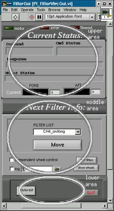 need to specify the log file name and dir (normally show wheels: shows a picture of both filter wheel and the current positions. Each filter is represented with a different color. The picture is updated on "real time." get filters: get the filter names. This should be used only if, for some reason, no names appears on the filters drop-down menu. 4.b. Lower AreaMotor init: Initializes both filter wheels. This action needs to be performed at least the first time you turn on the motor controller box. When you open the plug-in, it will try to communicate with the motor controller box. If it fails, it will write the error messages in the status area. When you press this button it performs the following actions: